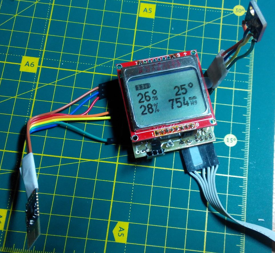 - Отображение напряжения питания и информации с датчиков на ЖК-дисплее 84*48 пикселей (NOKIA 3310/5110) - для возможности использования модуля в автономном режиме